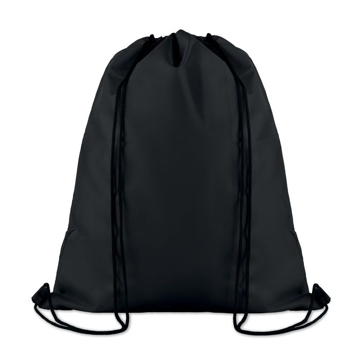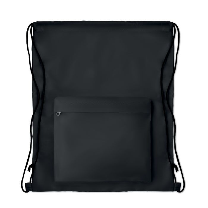 Large drawstring bag in 210D polyester with zippered front pocket.