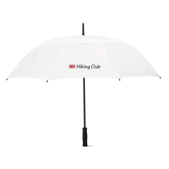Windproof 27 inch umbrella in 190T polyester with EVA handle. Frame and ribs in fiberglass, black plated and with black tips. Manual opening.